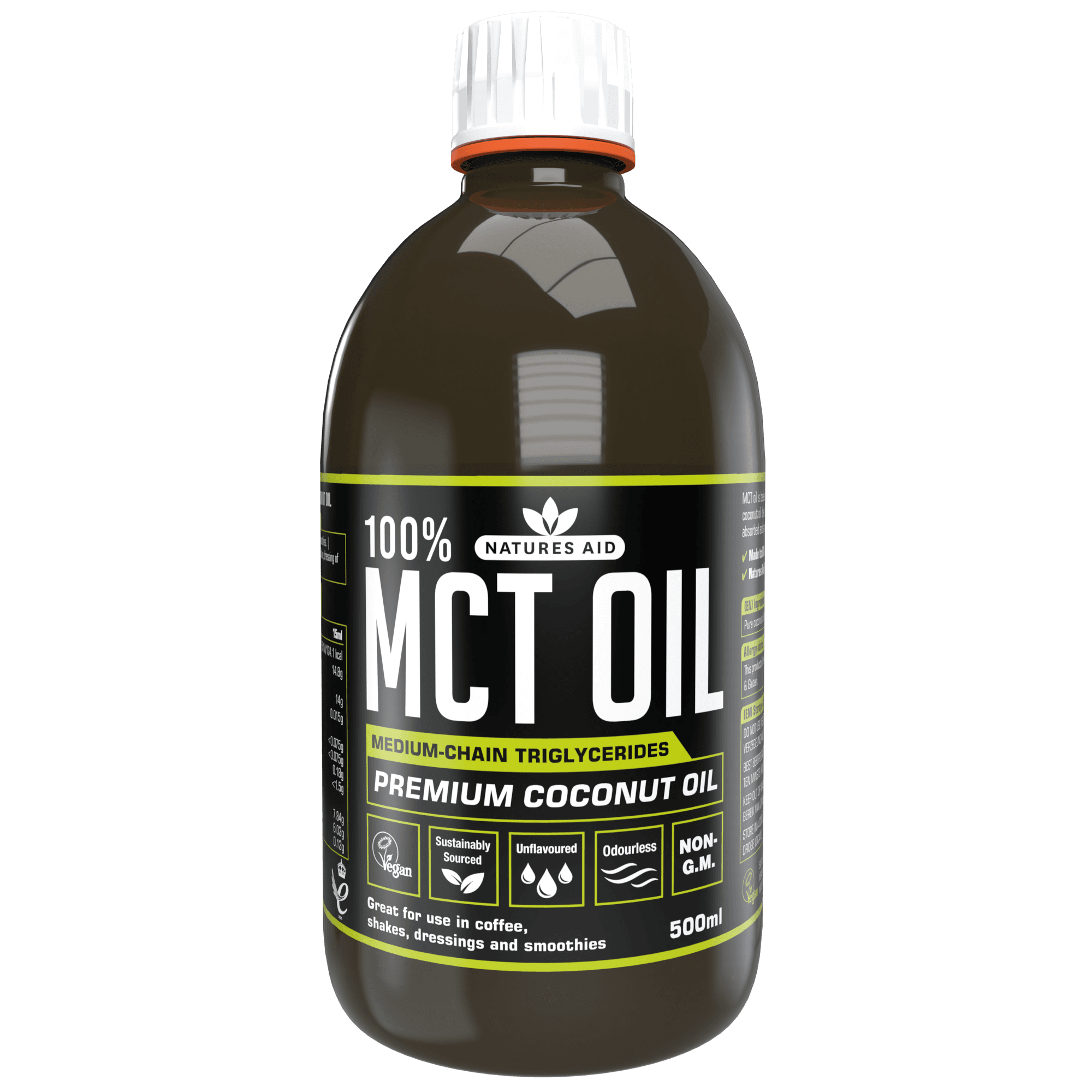 Natures Aid 100% 純 MCT 油採用優質 100% 純天然椰子油製成,由於去除了長鏈脂肪酸和月桂酸,MCT 油被認為比標準椰子油更容易被人體代謝。 MCT 油能被身體迅速消化,被是一種非常有用的能量來源。